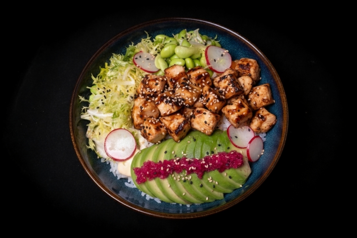 Sushireis,Edamame,avocado,karotten,Gemischte salat mit hause Dressing/Yuzu