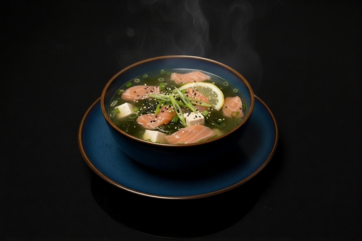 Lachs, Aalgen, frühlinglauch, zitronenscheiben sesam.