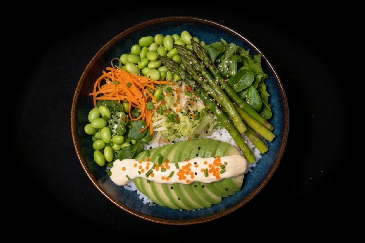 Sushireis, Edamame avocado, karotten, Gemischte salat Gebacken spargel mit hause Dressing/Yuzu/Tobiko mayo