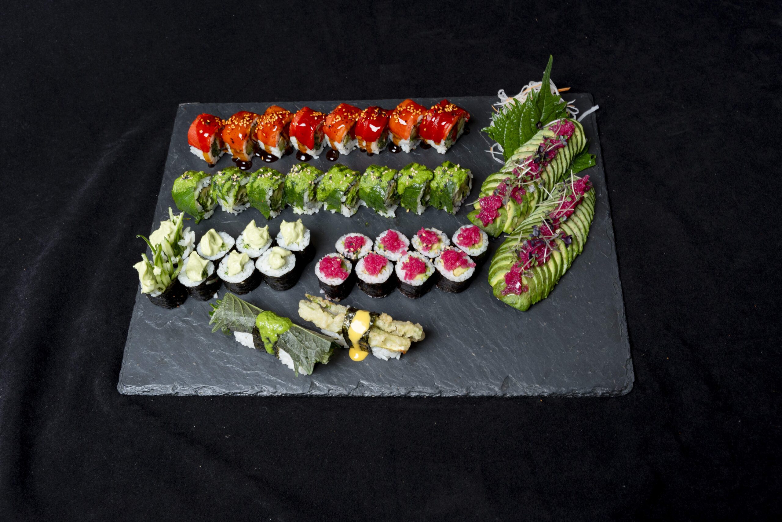 *Peperoni roll *Green Leaf roll *Avocado ceviche salsa *Gurke avocado cream maki *Shiso gurke nigiri *Tempura Spargel nigiri Avocado Sashimi