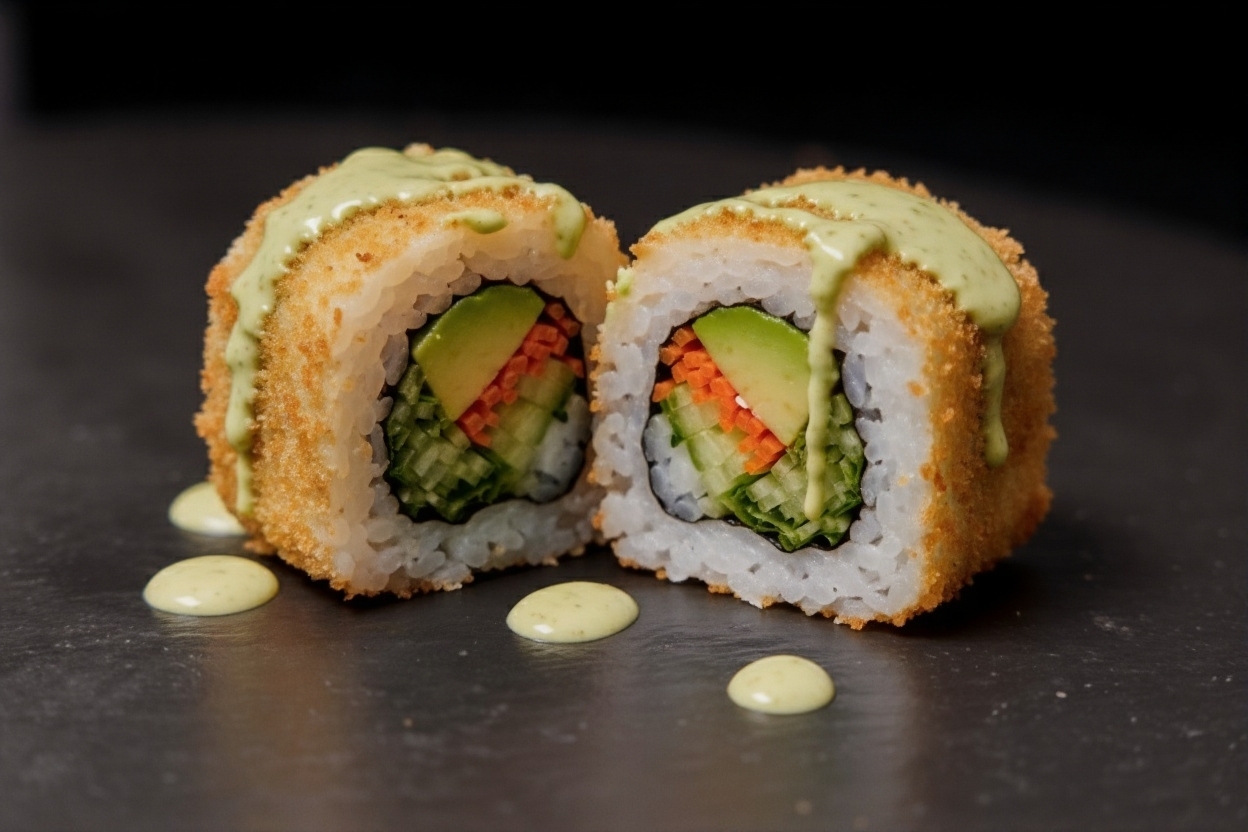 gurke avocado spargel karotten mit Panko crunch avocado creme soße